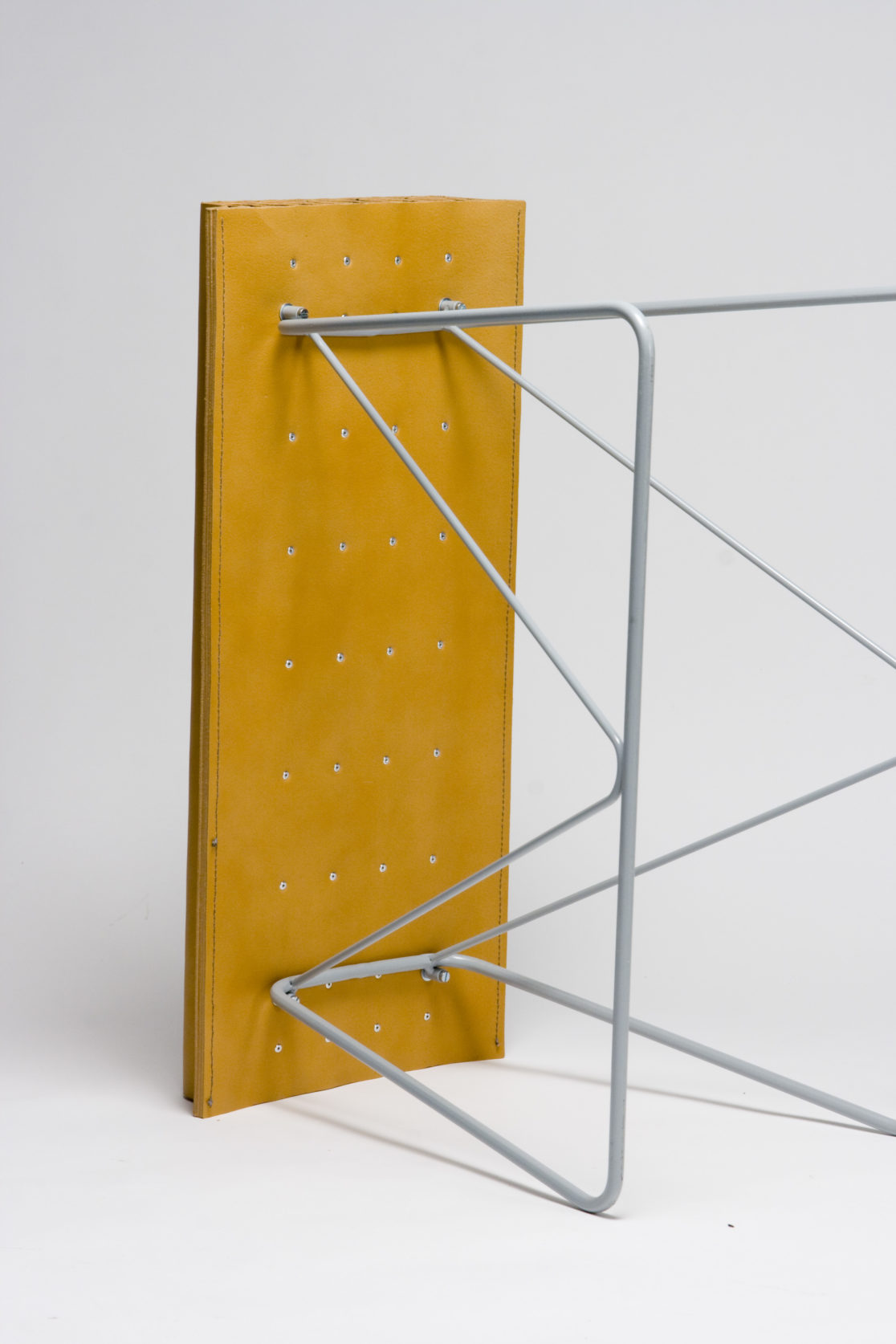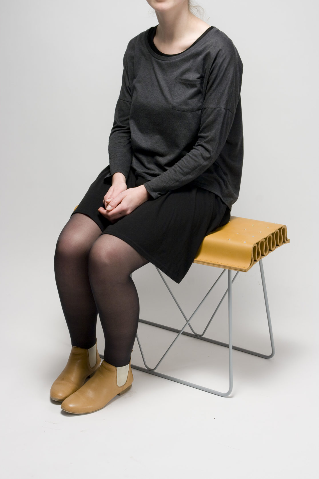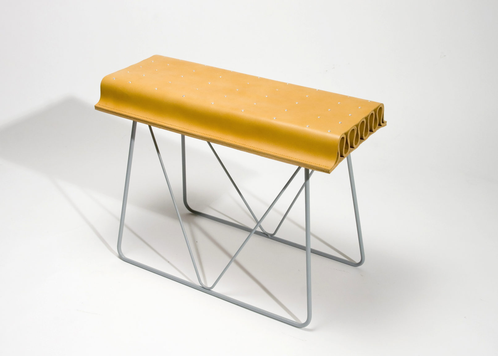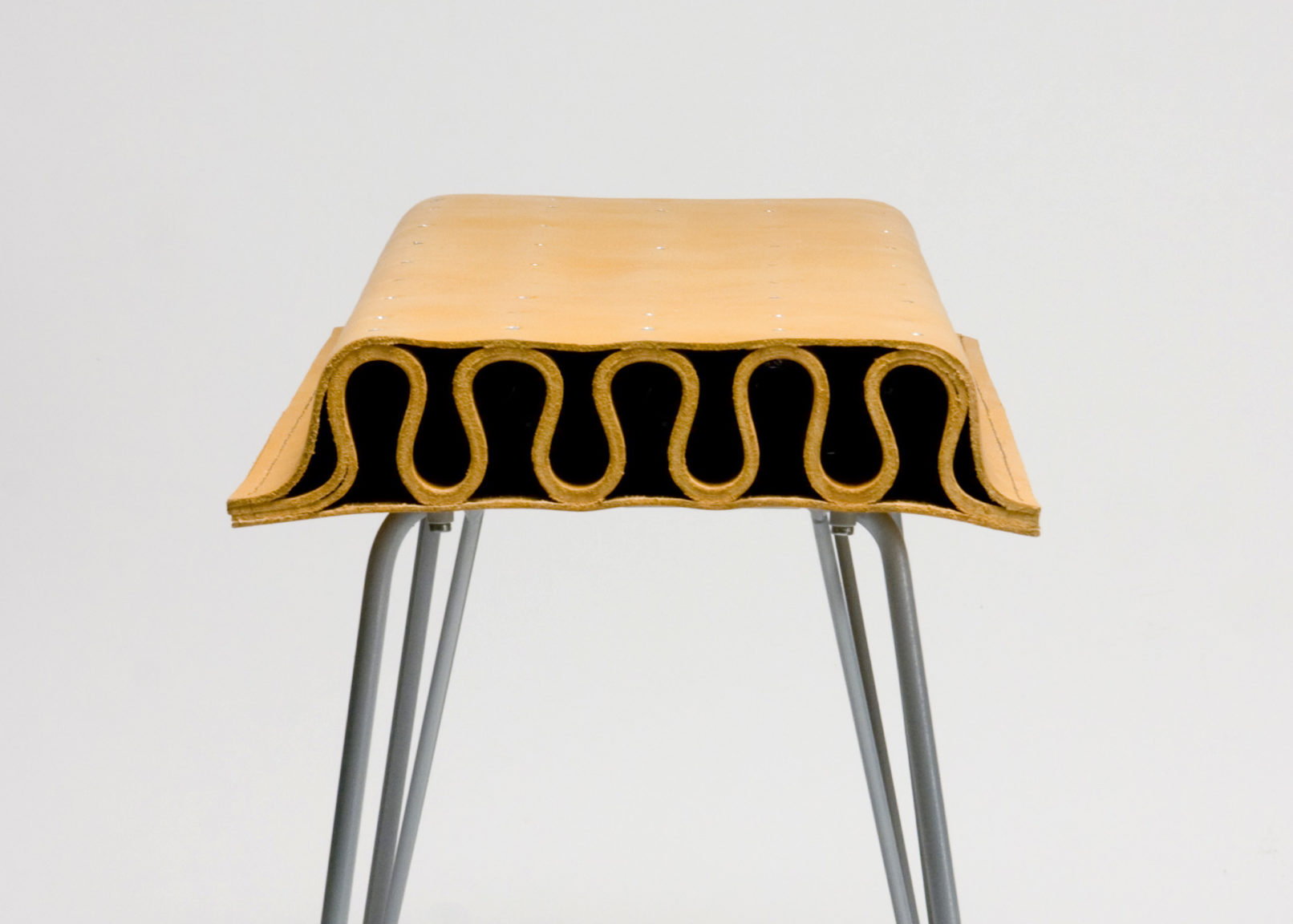 Ainsi, ce tabouret explore les propriétés structu- rantes du cuir. En ce sens, l’assise est un volume auto-structurant développé par l’ondulation de la peau, tout en concevant les propriétés de recouvrement du cuir et s’inscrivant ainsi dans une certaine forme de tradition.