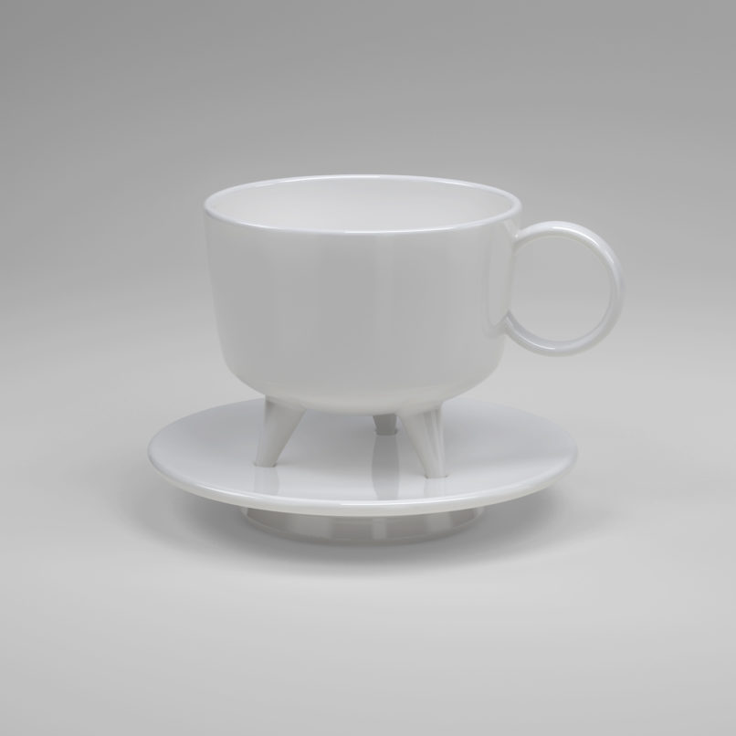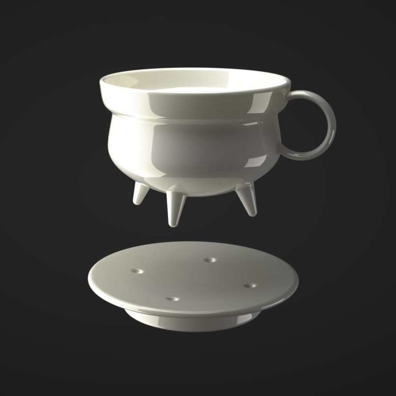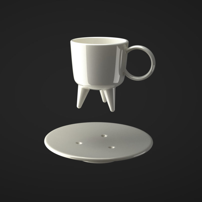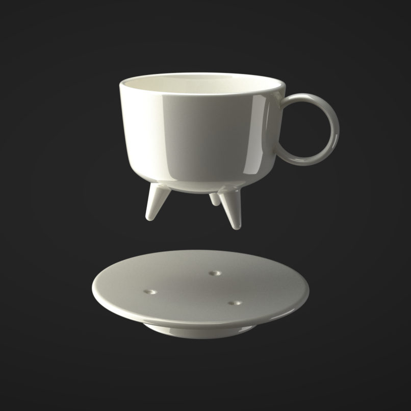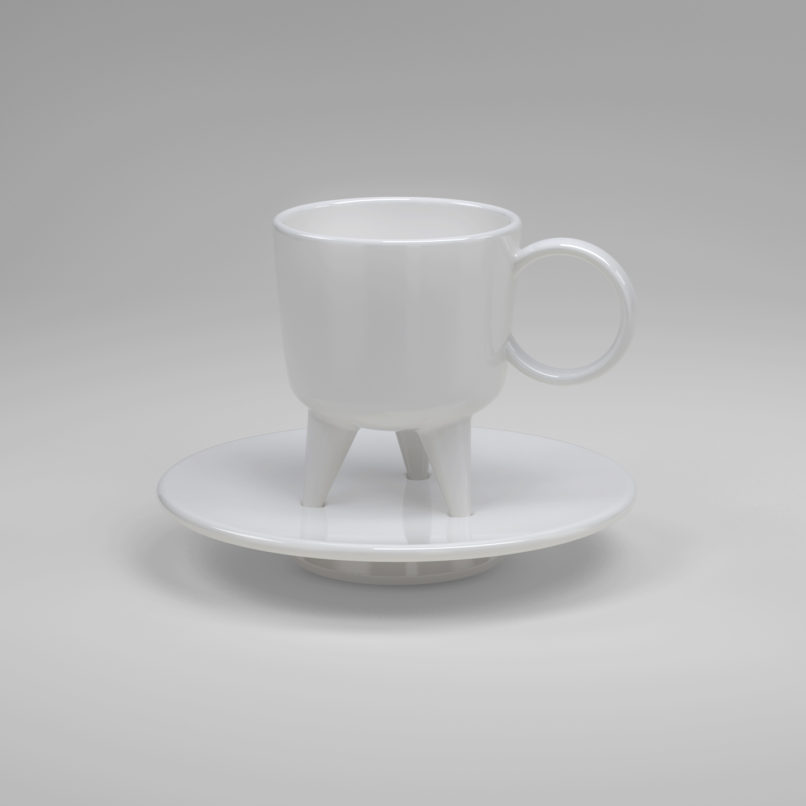 L’idée est de mettre sur pied la traditionnel tasse à café à l’instar du verre à vin qui lui confère stature et élégance. Cette ensemble de tasse pour la dégustation du café s’inspire des céramique précolombiennes et plus particulièrement de la poterie Maya dans laquelle le piétements des pots et contenants est fréquente. Les tasses sont réalisées par coulage sous pression, les soucoupes et plateau par calibrage.