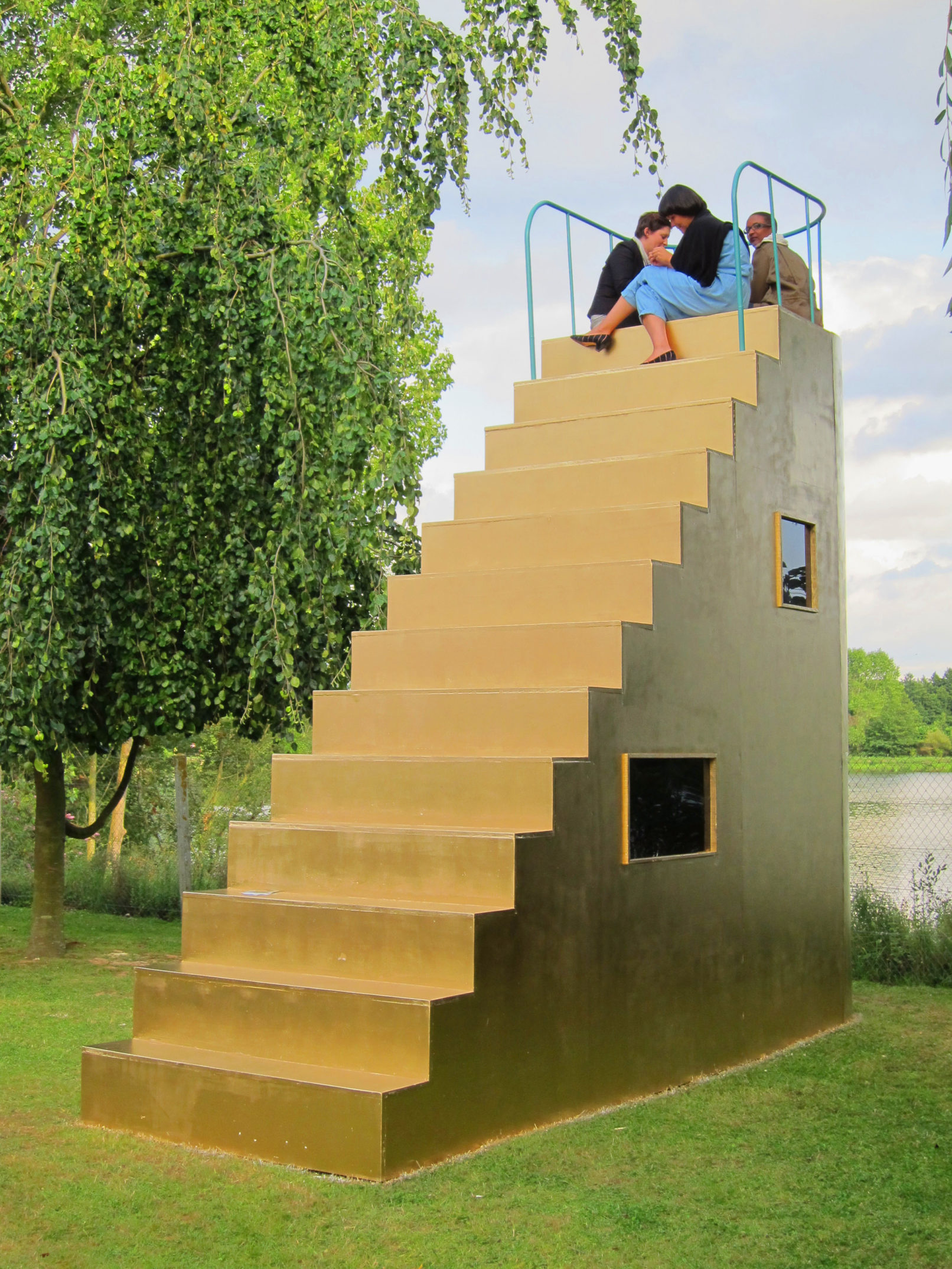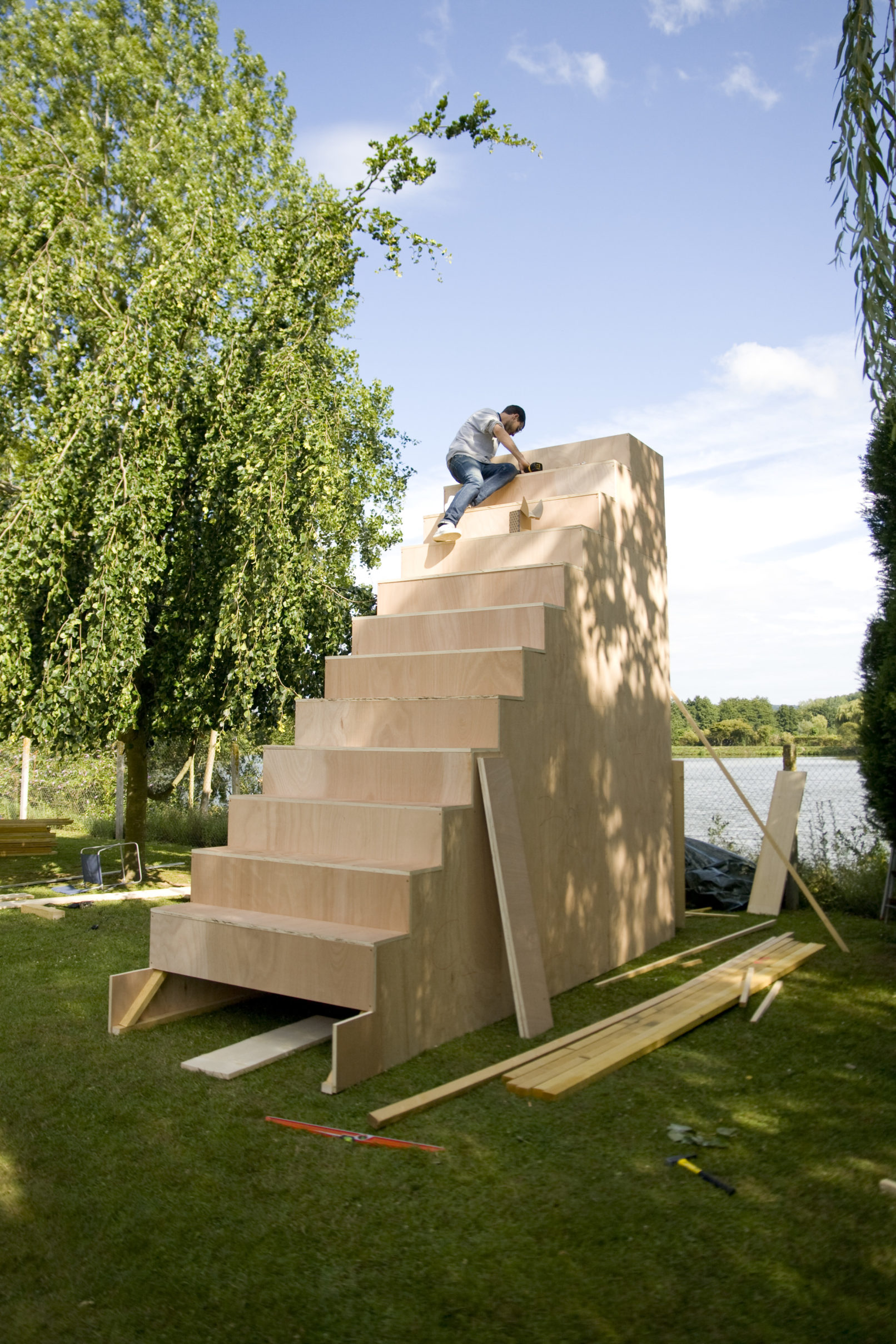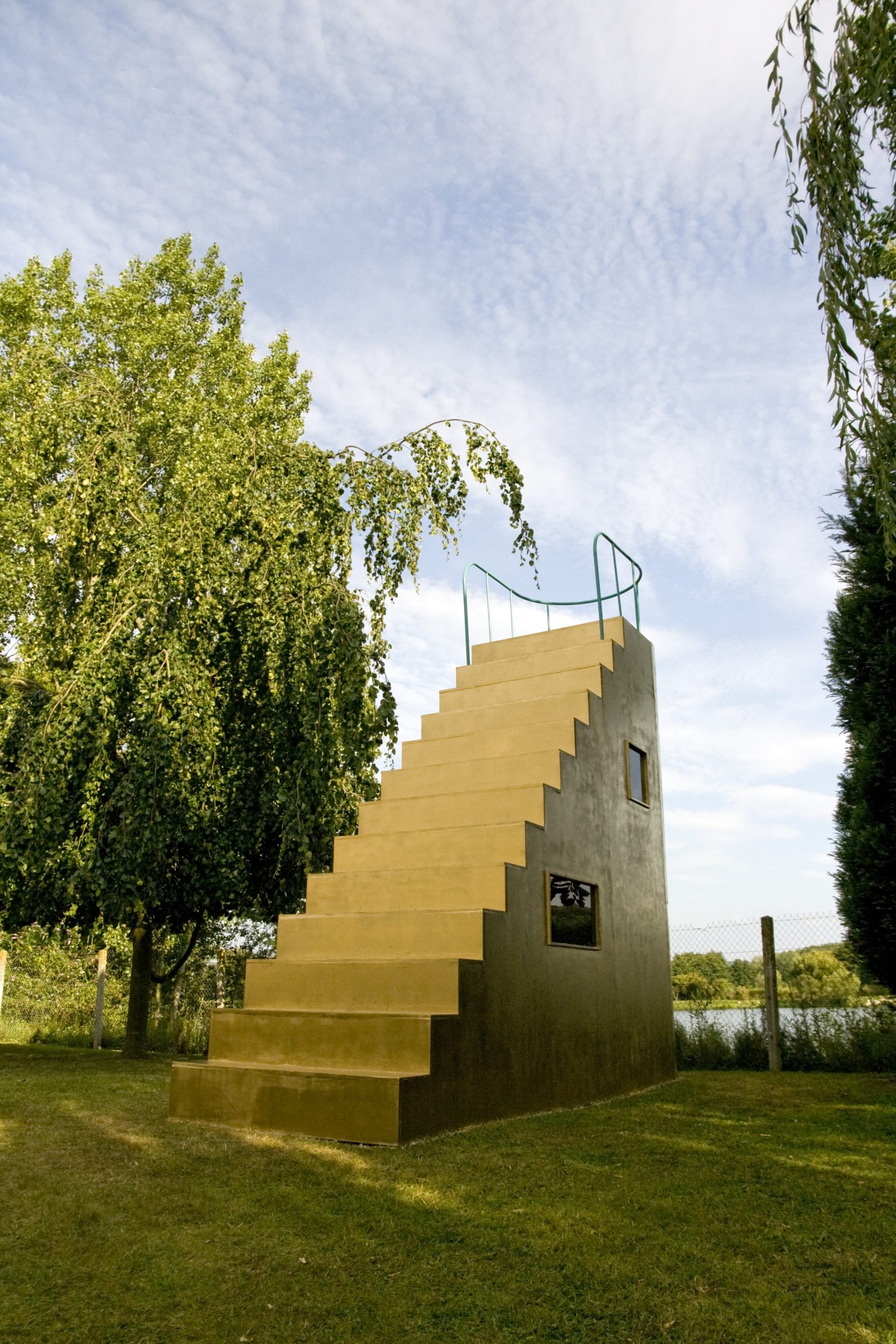 Une cabane qui se vit en deux temps. D’un point de vu extérieur, la construction aux allures de bel- védère, serait avant tout une sculp- ture praticable par le spectateur. Ce dernier, en gravissant les marches et en se hissant à son sommet pourra découvrir un point de vue inédit sur le cadre géographique. La cabane entièrement peinte