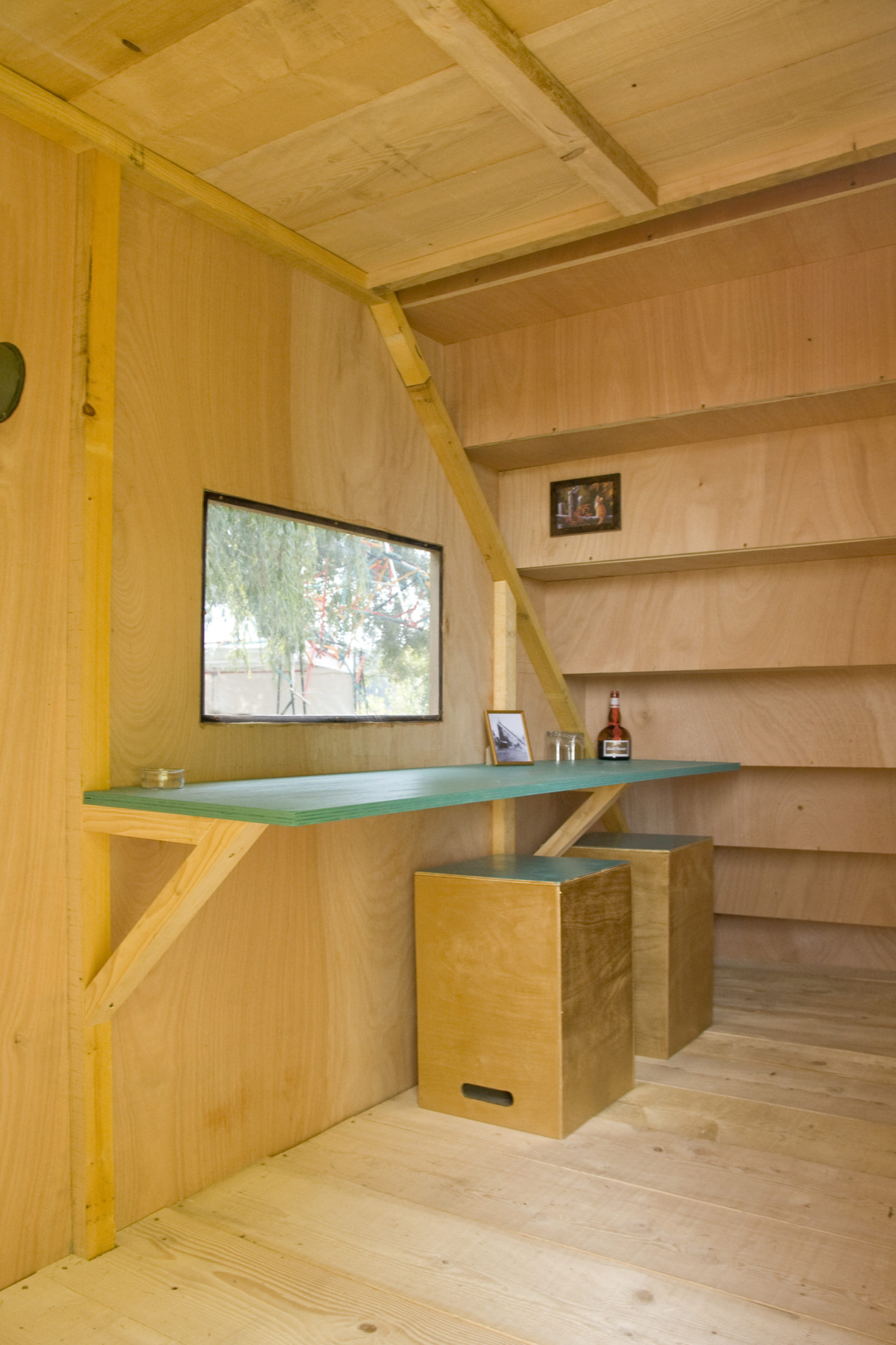 Dans un second temps, l’intérieur est un lieu de vie minimal, avec un bureau et un lit en mezzanine, offrant ainsi un confort minimum mais optimisé pour le vacancier venu se ressourcer. Nos références, allant du bunker, au kiosque à journaux, en passant par le temple Inca mettent en avant notre vision de la cabane comme une forteresse permettant de s’y sentir à l’abri tout en restant ouvert sur le monde qui nous entoure par le biais de son poste d’observation.